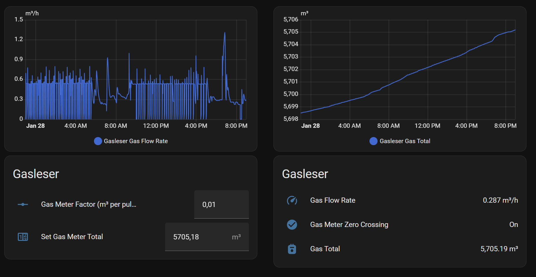 Das Gerät übernimmt den Wert sofort als Startpunkt für Gas Total und zählt ab dort weiter. Dank restore_value: true bleibt dieser Wert auch nach einem Stromausfall oder Neustart erhalten.