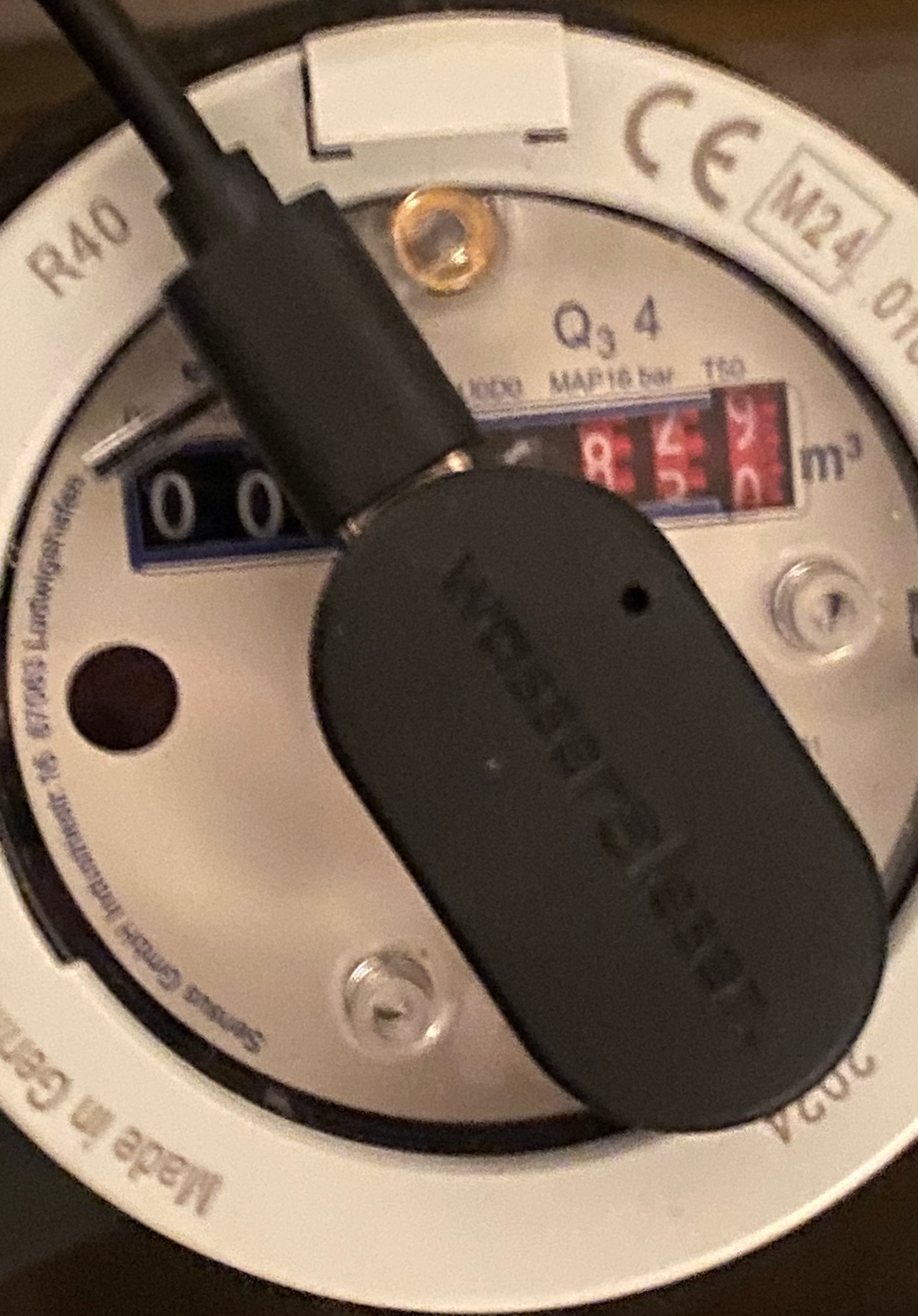 Der Wasserleser muss eben auf dem Wasserzähler aufliegen. Durch das Ladekabel hat sich der Wasserleser minimal angehoben und ich vermute, dass dadurch die Umdrehungen nicht mehr sauber erkannt wurde. Jetzt, nachdem ich alles ordentlich mit dem Metallplättchen befestigt habe, passt der ermittelte Zählerstand ziemlich genau.