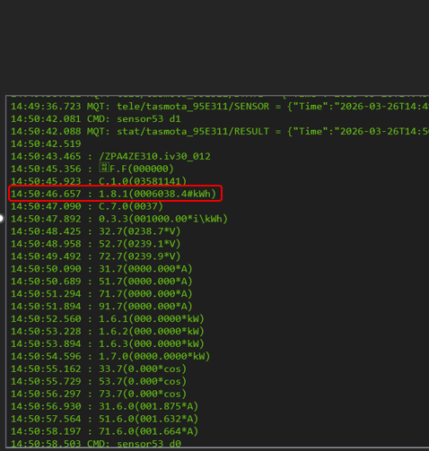 Um zu prüfen, ob der Energiezähler Daten sendet, habe ich in der Konsole den Befehl „Sensor53 d1“ eingegeben. Dabei wurden mir die korrekten Daten in der Konsole angezeigt. Allerdings werden diese Daten auf der Tasmota-Weboberfläche nicht dargestellt.