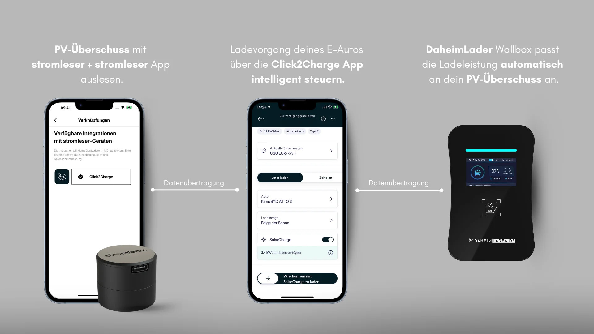 In Kombination mit einer intelligenten Wallbox – wie DaheimLaden – kannst du den PV-Überschuss gezielt für dein Fahrzeug nutzen. Der stromleser liefert dabei die Echtzeitdaten aus deinem Stromzähler und stellt sie der Click2ChargeApp zur Verfügung.