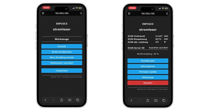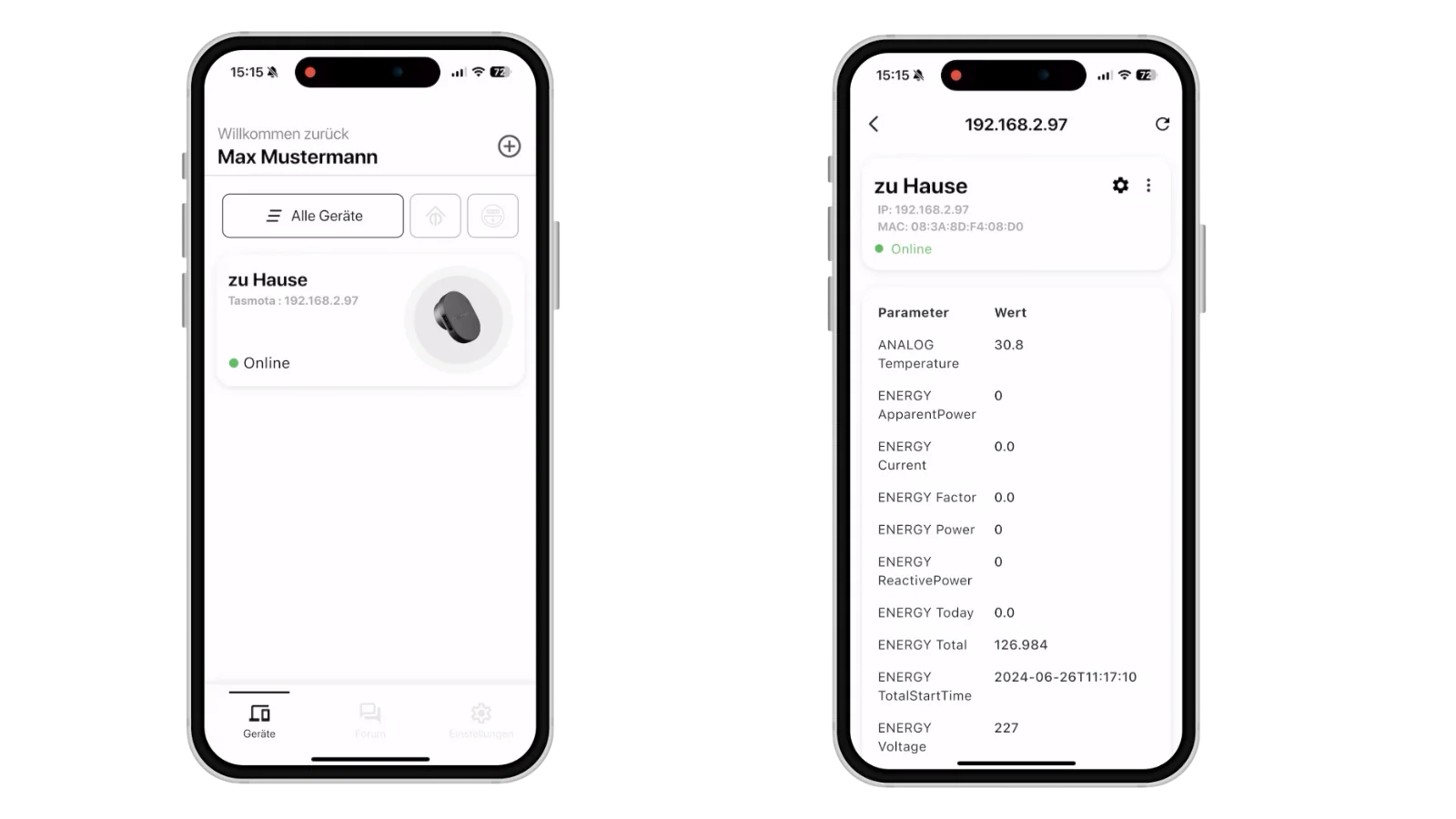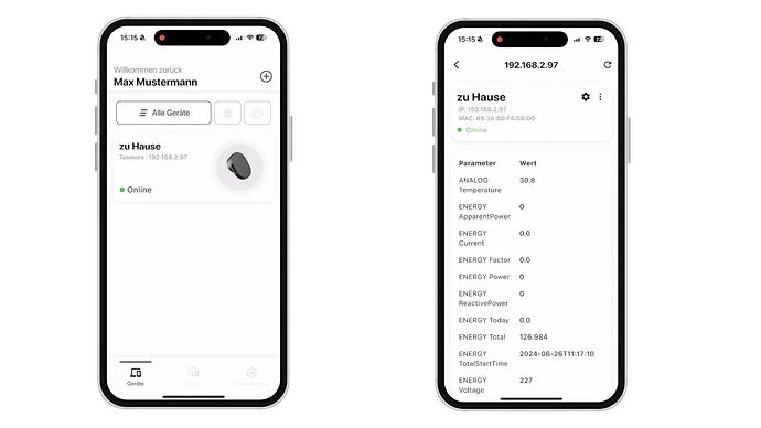 Danach erscheint der stromleser.tasmota im Home-Bereich der App – dort werden alle Werte übersichtlich angezeigt.