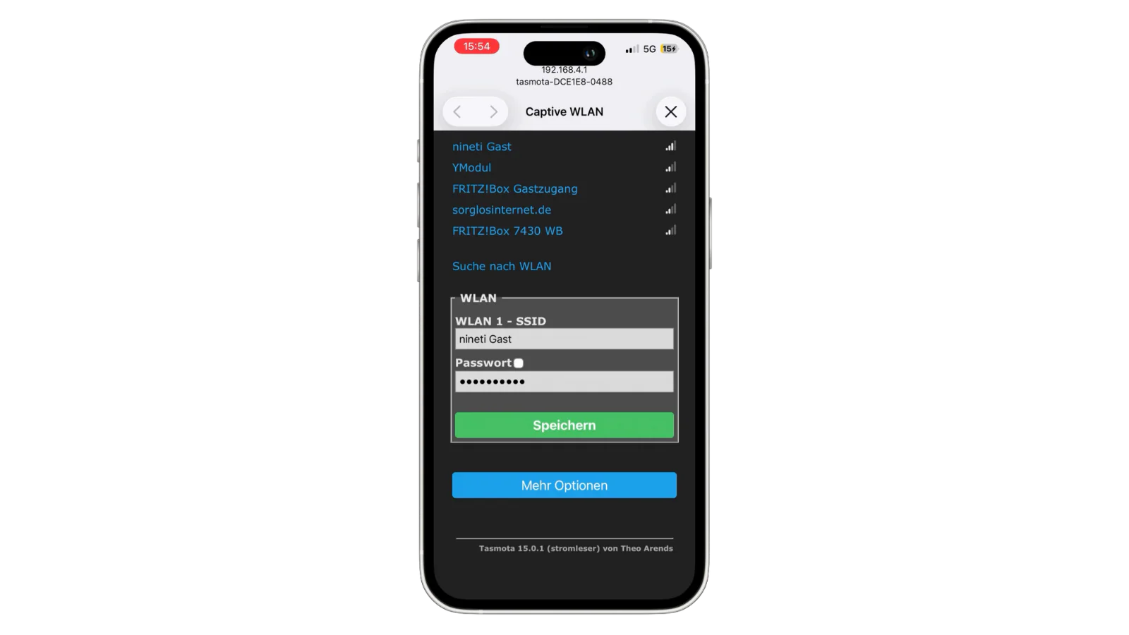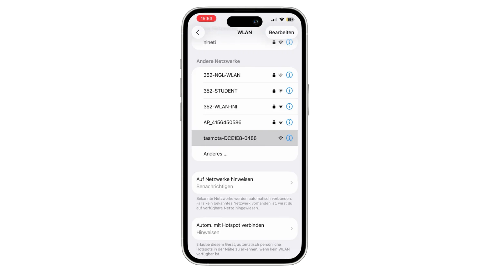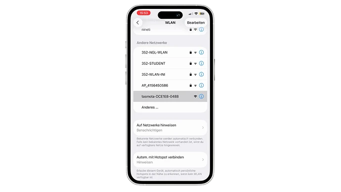 1. Mit Tasmota-WLAN verbinden: Öffne die WLAN-Einstellungen deines Smartphones und wähle das Tasmota-Netzwerk aus.