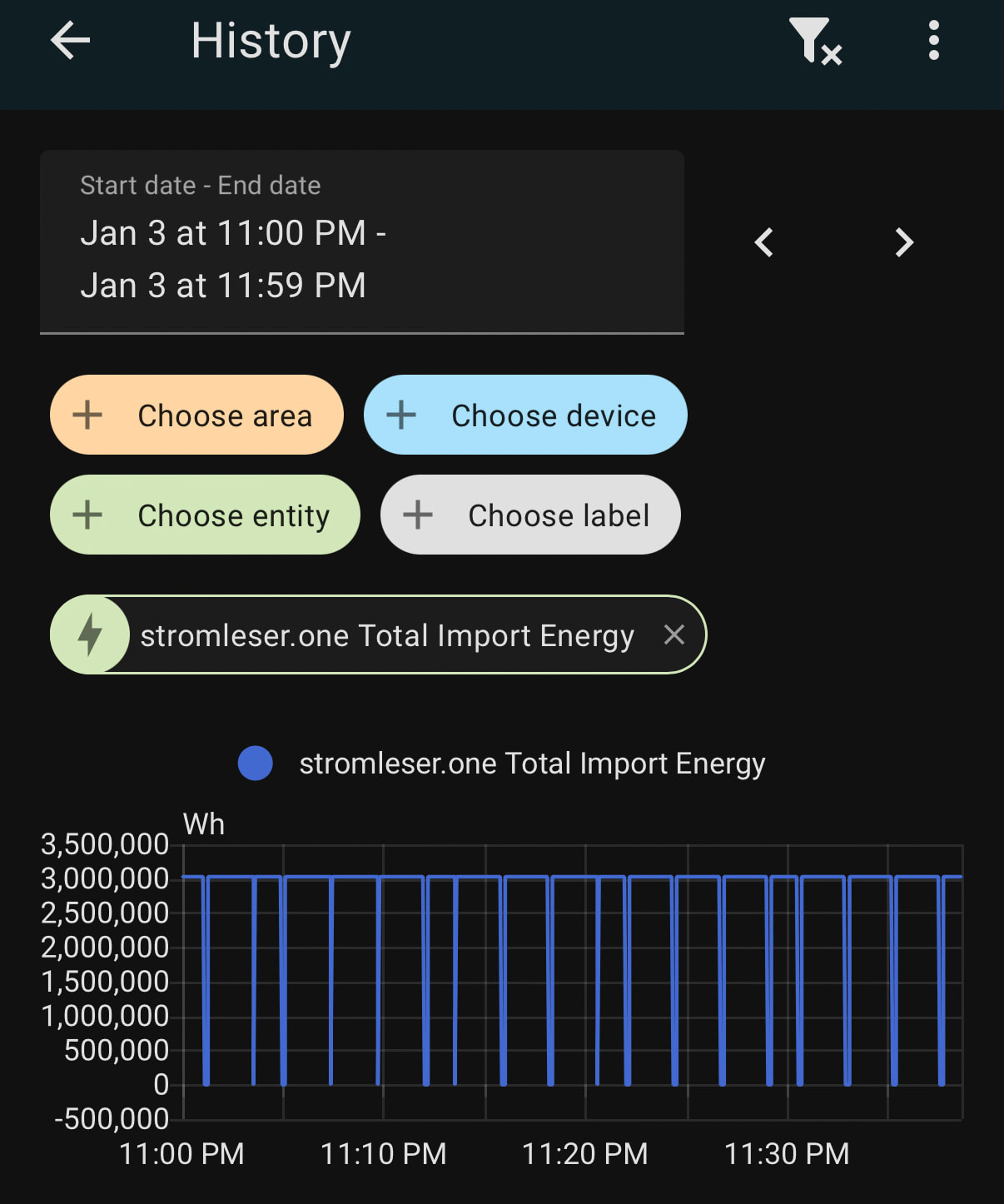 der stromleser one sendet in der total Energie alle paar Minuten 0 Werte über mqtt. In der App scheint es korrekt zu laufen.