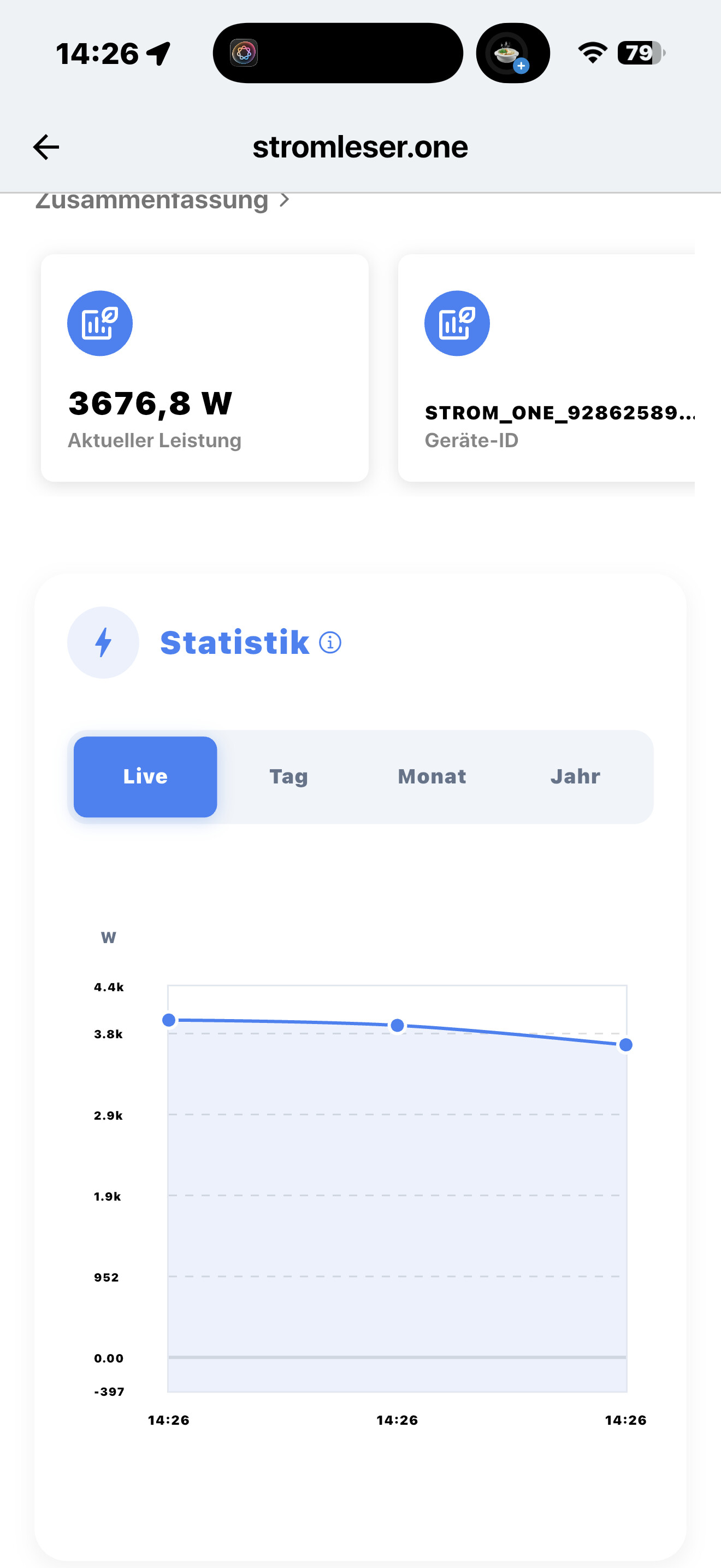 In dem aktuellen Fall findet eine Einspeisung ins Netz von meiner PV-Anlage von knapp 3,7kW statt. Die Live-Kurve befindet sich aber nicht im Minus, wie man es erwarten sollte, sondern im Bereich Netzbezug. In der Gesamtverbrauchsanzeige wird es aber der Einspeisung angerechnet.