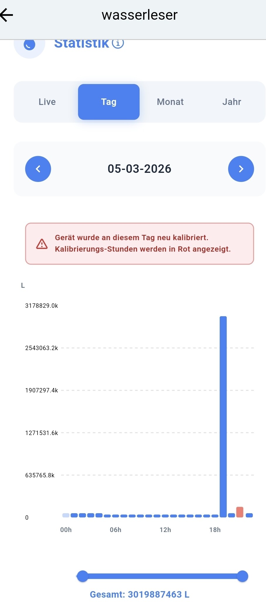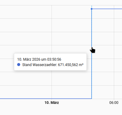 Nach dem ich den letzten Ausreißer am 18.1.26 hatte und durch den Wechsel der Wasseruhr am 27.2. alles neu kalibrieren musste, lief der wasserleser erfreulich problemlos - bis heute früh: wie er auf die Idee kam, 2m³ rückwärts zu springen, ist mir unklar.