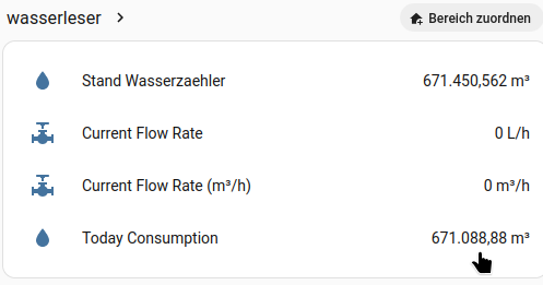 - auf die Entität des Wasserlesers (Gesamtverbrauch m³ bzw. Cost €) gehen